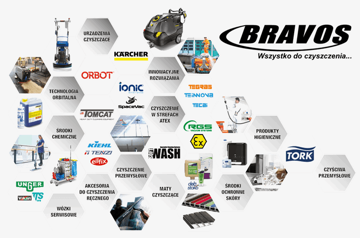 BRAVOS jest jednym z największych dostawców innowacyjnych systemów czyszczących dla klienta indywidualnego, przemysłowego oraz usługowego. W ofercie obecnie posiada szeroką gamę urządzeń, środków chemicznych oraz sprzętu ręcznego dla firm sprzątających do mycia okien, paneli fotowoltaicznych, odkurzania na wysokości konstrukcji i miejsc trudno dostępnych, rozwiązania bezpieczne dla środowiska i wspierające jego ochronę, po specjalistyczne technologie dla różnych gałęzi przemysłu, również w strefie ATEX.