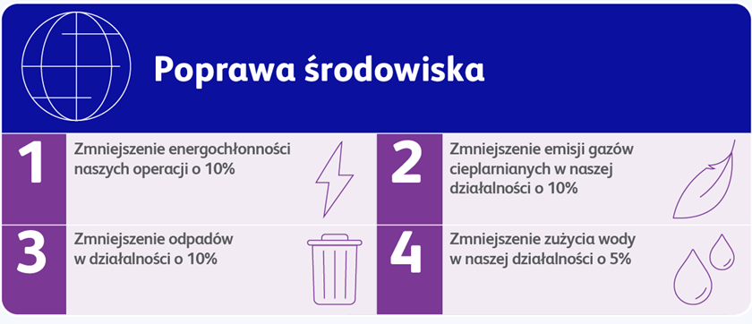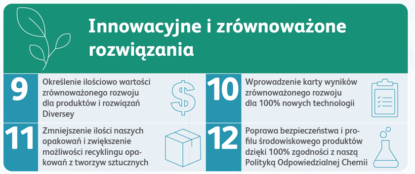 Diversey zawsze postrzegał dbałość o środowisko, jako skuteczną strategię biznesową. Eliminacja marnotrawstwa w naszej działalności i zwiększenie wydajności poprzez odpowiednie wykorzystanie zasobów we wszystkich obiektach Diversey napędza postęp w zakresie ochrony środowiska i zwrot finansowy z inwestycji. Ponadto, nasze zaangażowanie w ochronę środowiska wykracza poza naszą działalność. Wykorzystujemy możliwość ograniczenia ilości odpadów, oszczędzenia wody i energii na obiektach naszych klientów, dostarczając innowacje ukierunkowane na zrównoważony rozwój. Nasze podejście w kwestii projektowania produktów przechodząc przez cały cykl jego życia i wszystkie powiązane aspekty sprawia, że zapewniamy bezpieczeństwo i ochronę środowiska w całym łańcuchu wartości.