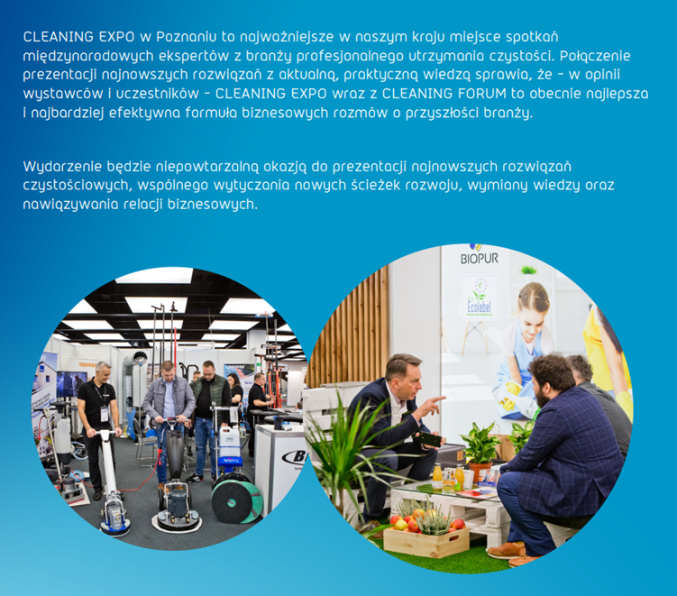 Targi Cleaning Expo to już druga edycja wydarzenia zrzeszającego branżę czystości w Polsce. To tutaj spotkają się liderzy rynku, branżowi eksperci, producenci sprzętu i środków czystości, fachowcy oraz osoby stawiające swoje pierwsze kroki w biznesie świadczenia usług utrzymania czystości. Szeroki przekrój ekspozycji i wysoki poziom merytoryczny to znaki charakterystyczne tego wydarzenia.