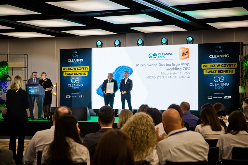 Wśród produktów rywalizujących o Złoty Medal, szczególnie wyróżniają się innowacyjne rozwiązania, które powstały w oparciu o najnowocześniejsze technologie. Nagrodę Grand Prix Grupy MTP w konkursie Złoty Medal na targach Cleaning Expo 2024 otrzymał Micro Sweep Duotex Ergo Mop, wykonany w 70% z materiałów z recyklingu, firmy Micro System Duotex. Nagrodę odebrał Pan Marek Stefaniak, właściciel firmy. Ten innowacyjny produkt nie tylko minimalizuje zużycie chemikaliów, ale także przyczynia się do ochrony środowiska.