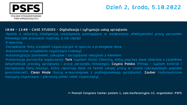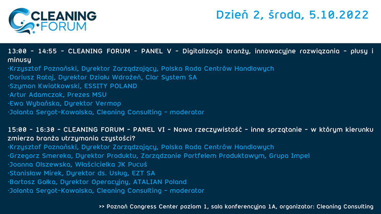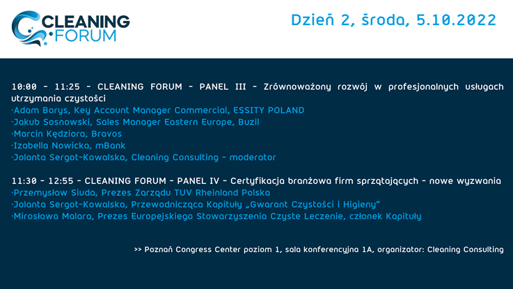 Dziś to już ostatnia szansa, aby zapoznać się z szeroką ofertą firm z branży cleaningowej. To pierwsze takie wydarzenie w Polsce, dające możliwość podniesienia kompetencji i wzbogacenia swojej wiedzy, jak również prezentacji nowości i prowadzenia rozmów biznesowych. Dlatego warto wykorzystać okazję i nawiązać nowe kontakty, podnieść praktyczną znajomość nowoczesnych narzędzi i nadchodzących trendów.