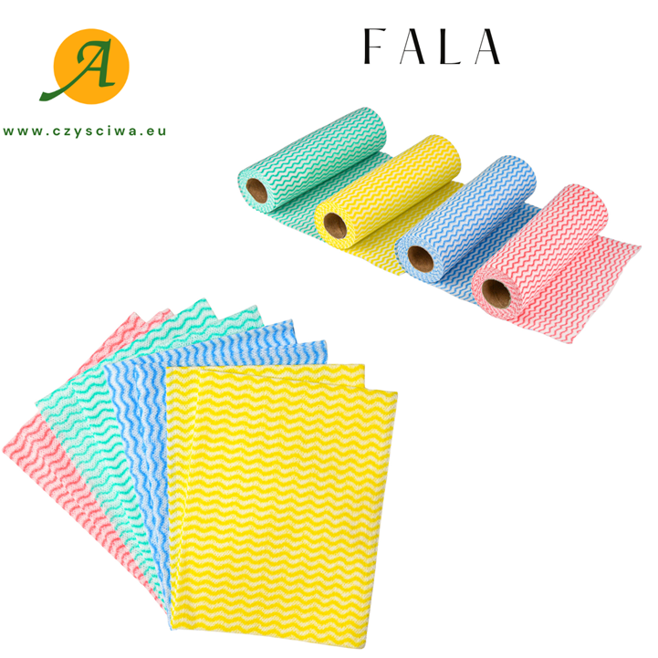 - ściereczki fala - to kolejne propozycja z segmentu kolorowych czyściw. Połączenie wiskozy i poliestru w tym czyściwie umożliwia łatwość i precyzyjność usuwania brudu, dziurkowana struktura umożliwia szybkie sprzątanie.